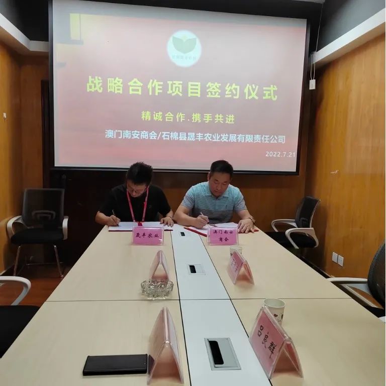 7月21日,石棉縣晟豐農業發展有限責任公司與澳門南安商會,就大理石漢白玉、碳酸鈣下游產業達成合作意向,董事長鄭烽同志代表我司正式簽署戰略合作框架協議,本次合作協議的簽署,是我公司成立以來首次針對外資進行招商引資的正式簽約。