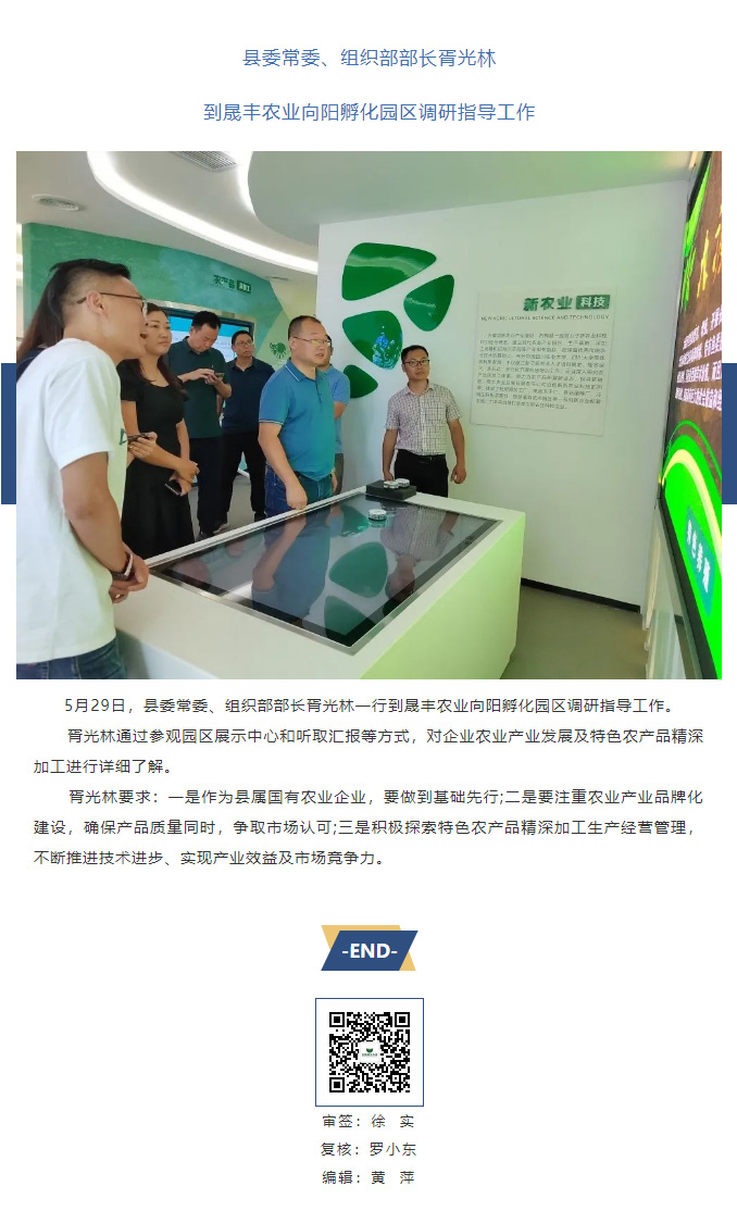 縣委常委、組織部部長胥光林一行到晟豐農業向陽孵化園區調研指導工作