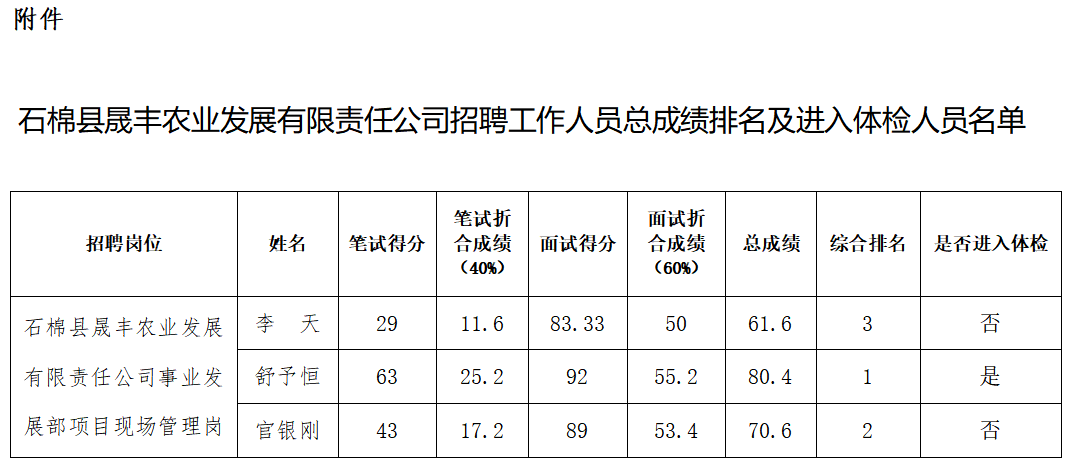 石棉縣晟豐農業發展有限責任公司招聘事業發展部工作人員筆試、面試工作已結束,根據《石棉縣晟豐農業發展有限責任公司招聘工作人員公告》規定,現將總成績排名及進入體檢人員名單予以公告,并將體檢有關事宜公告如下。