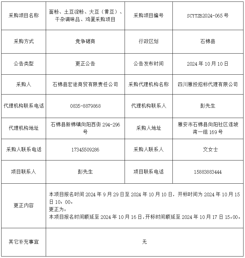 面粉、土豆淀粉、大豆(黃豆)、干雜調味品、雞蛋采購項目更正公告