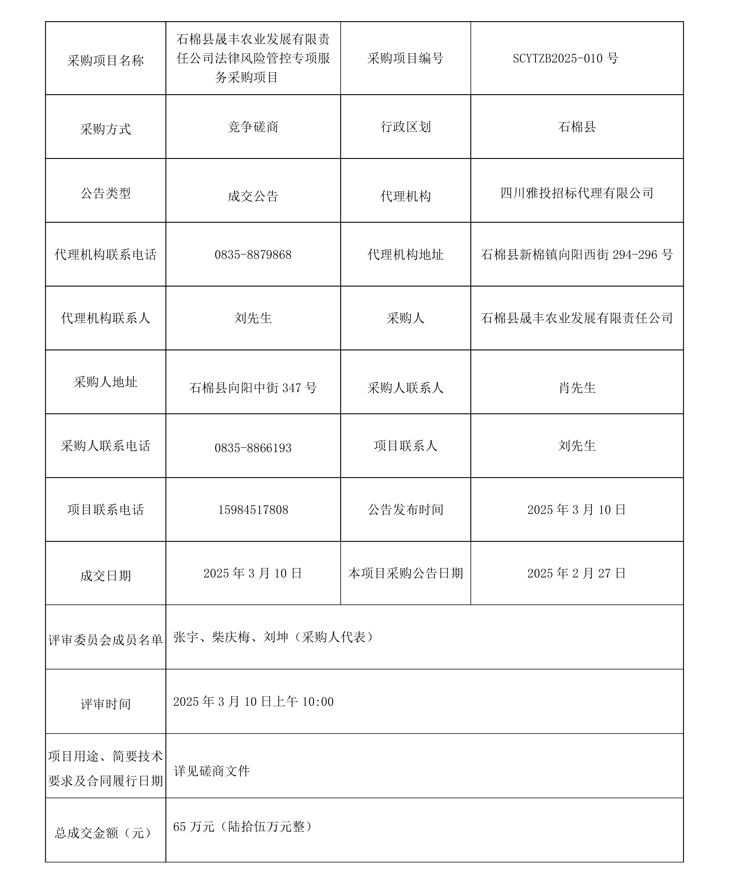 石棉縣晟豐農業發展有限責任公司法律風險管控專項服務采購項目成交結果公告